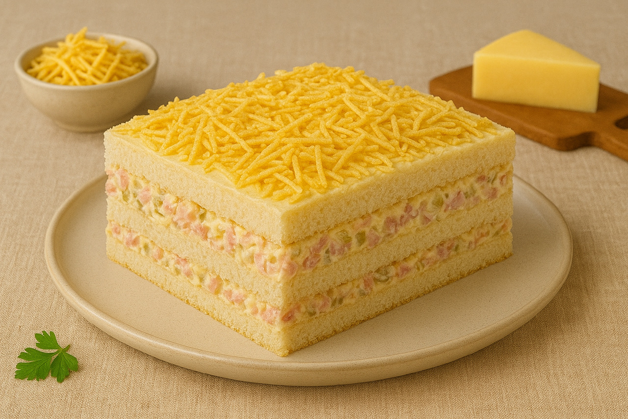 Para o recheio, misture muito bem os ingredientes. Reserve. Na vasilha em que for servir, forre o fundo com as fatias de pão e espalhe o recheio. Faça camadas de pão e recheio até finalizar. Cubra e leve para refrigerar. Não congele. No momento de servir, polvilhe toda a superfície com a batata palha e o queijo.