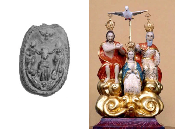 3. Há a presença da Virgem Maria na imagem do Divino Pai Eterno, assim como na medalha que foi encontrada pelo casal de agricultores. Nela, o Pai, o Filho e o Espírito Santo coroam Nossa Senhora.