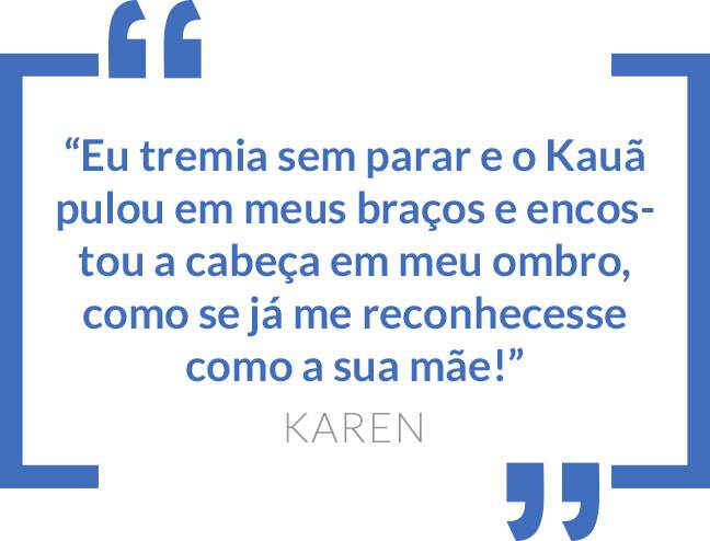 Porém há outro fator que Karen assume ter contribuído bastante. Angustiada com a demora de 5 anos de espera, ela pediu sinais a Deus, se haveria de desistir ou não. Era um domingo, durante a celebração de uma missa, ela disse: “O Senhor sabe do que eu preciso!”, na segunda-feira, o telefone tocou e ela foi conhecer o Kauã, naquele momento se sentiu mãe e a sua vida mudou, segundo ela, amparados pela mão de Deus.