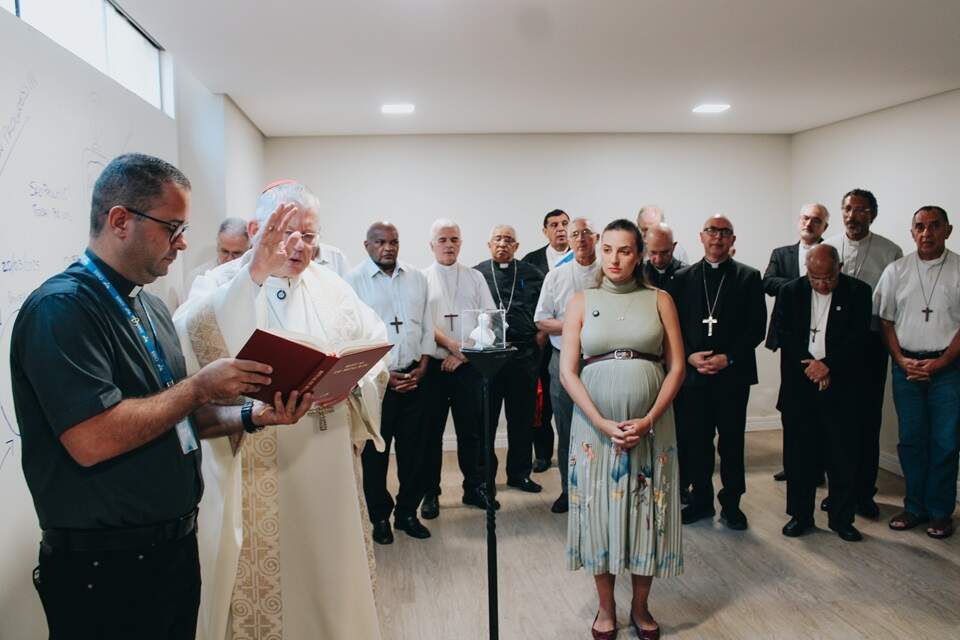 Antes da cerimônia, os bispos assinaram uma das colunas do espaço do novo estúdio. Padre Arnaldo relacionou a estrutura que sustenta as paredes com os bispos e sua missão na Igreja. Ali, as assinaturas ficarão preservadas como um memorial.