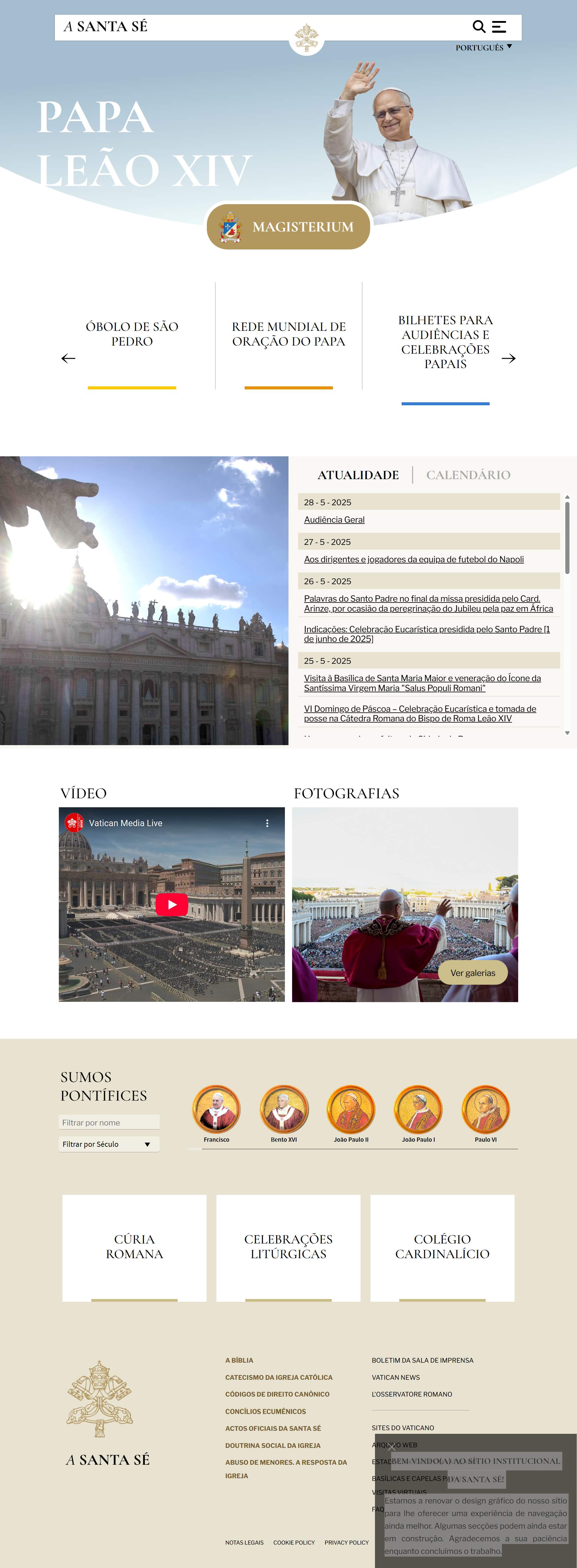 “Bem-vindo(a) ao sítio institucional da Santa Sé! Estamos a renovar o design gráfico do nosso sítio para lhe oferecer uma experiência de navegação ainda melhor. Algumas secções podem ainda estar em construção. Agradecemos a sua paciência enquanto concluímos o trabalho”, diz a mensagem em português de Portugal. O site, entretanto, oferece os mesmos conteúdos em outros oito idiomas: francês, inglês, italiano, espanhol, alemão, árabe, japonês e latim.