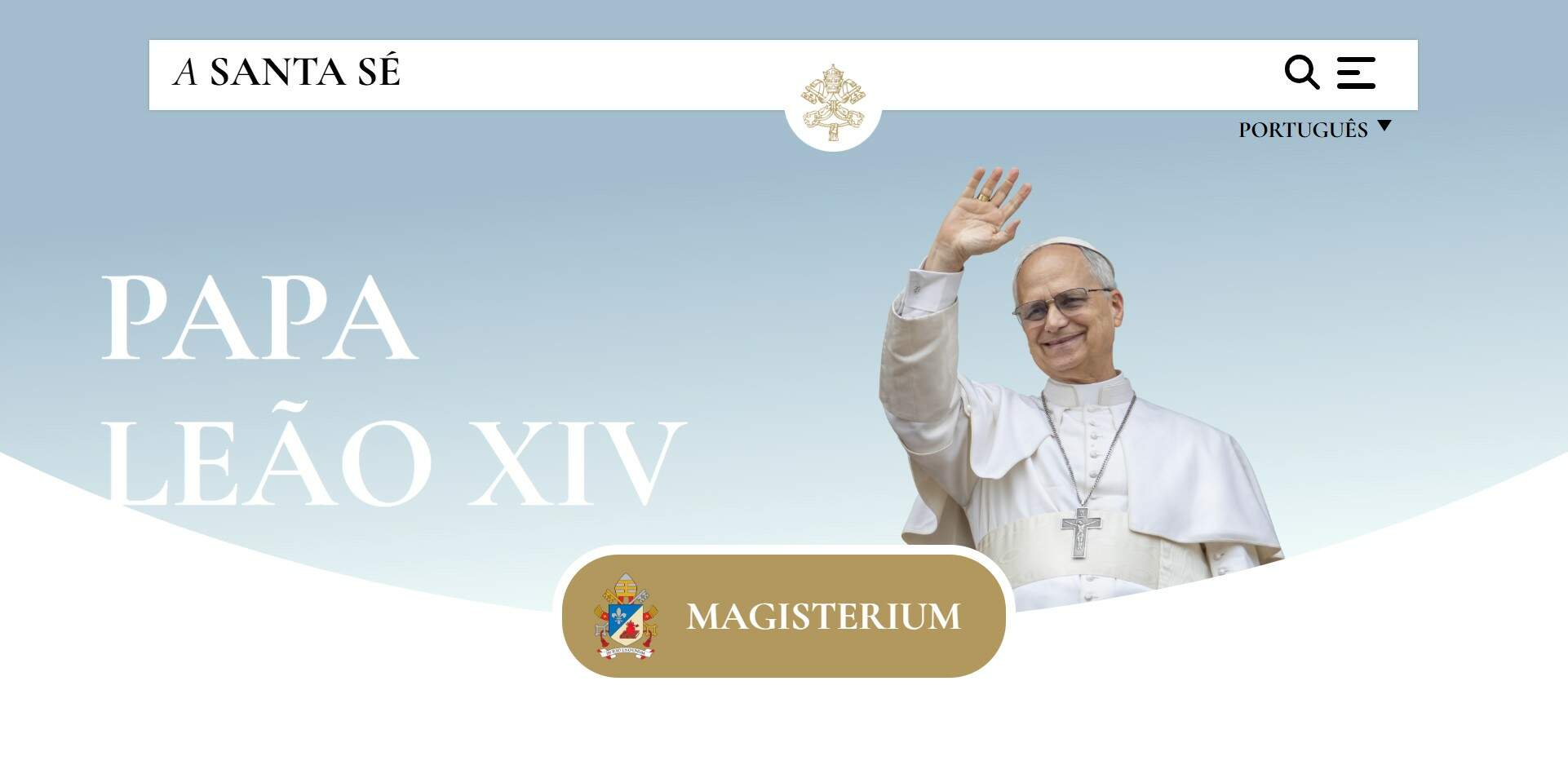 A nova proposta traz uma interface mais limpa, moderna e intuitiva. O fundo, agora em tons de azul, oferece um visual mais leve. No topo do site, destaca-se a foto do Papa Leão XIV, eleito recentemente, acompanhado do brasão papal e da palavra "Magisterium", sinalizando o acesso aos principais documentos do Pontificado.
