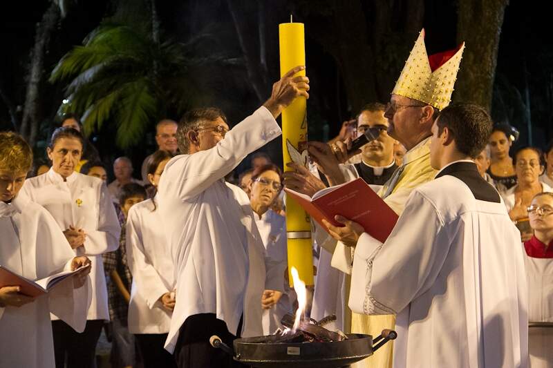 Na Solene Vigília Pascal da noite será celebrada a Missa da Ressurreição. Essa missa é precedida pela bênção do Fogo Novo e do Círio Pascal, benção da água Batismal e Renovação das Promessas do Batismo. Todos os fiéis devem levar velas.