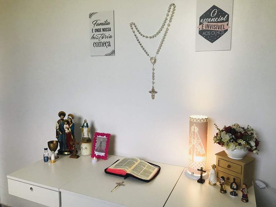 Não precisa ser algo complicado. Basta separar um cantinho reservado onde você possa colocar uma ou mais imagens de santos, a bíblia e velas, por exemplo.