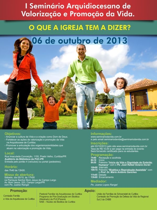 O encontro promovido pela Comissão Família e Vida da Arquidiocese de Curitiba tratará de temas de profundo interesse social apresentado por especialistas. O seminário tem como objetivo anunciar a cultura da vida, a criação como dom de Deus, e promover a articulação dos organismos, entidades e instituições que atuam na valorização da vida.