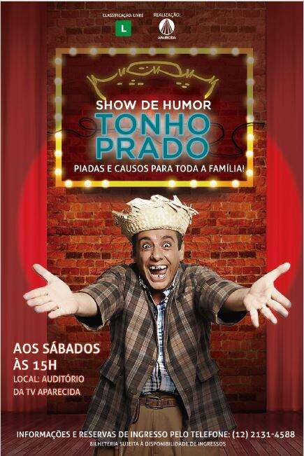 Todos os sábados, durante os meses de setembro e outubro, Tonho Prado apresentará, no auditório padre Orlando Gambi em Aparecida um show de humor, piadas, prosa e interpretações.