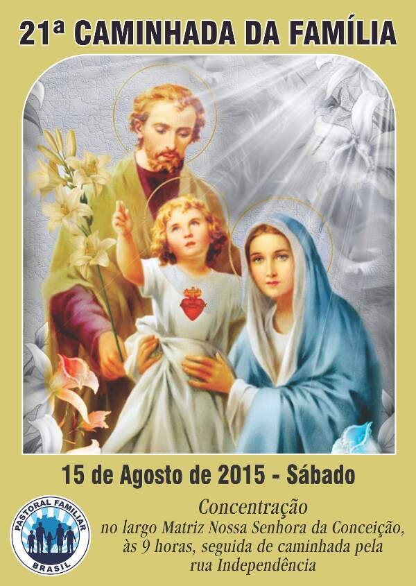 A Diocese de Novo Hamburgo (RS) promove no dia 15 de agosto a 21ª Caminhada da Família com o objetivo de reunir as dez paróquias da área pastoral de São Leopoldo, com um público estimado de 5 mil pessoas. A iniciativa marcará o encerramento da Semana Nacional da família da Conferência Nacional dos Bispos do Brasil (CNBB), realizada de 9 a 15 de agosto na Igreja católica.