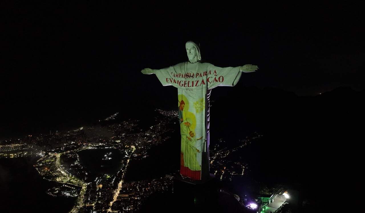 Nesta segunda-feira (24), o monumento ao Cristo Redentor, localizado no alto do morro do Corcovado, recebeu uma projeção especial do cartaz da Campanha para a Evangelização 2024.