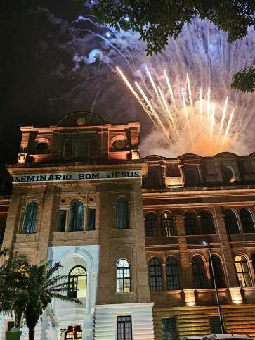 A beleza da arquitetura do histórico Seminário Bom Jesus ganhou ainda mais destaque com a projeção de luzes coloridas e imagens. E, nem mesmo a chuva que insistia em cair, não desanimou quem estava no local.