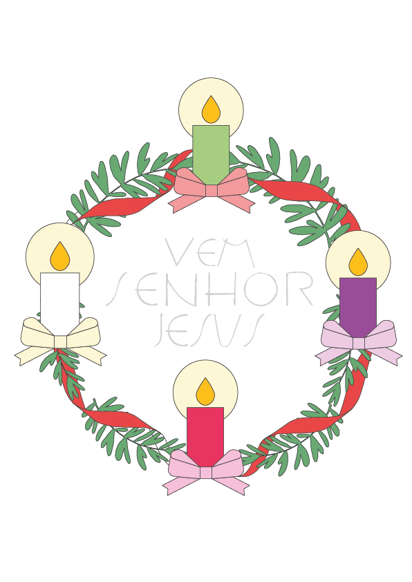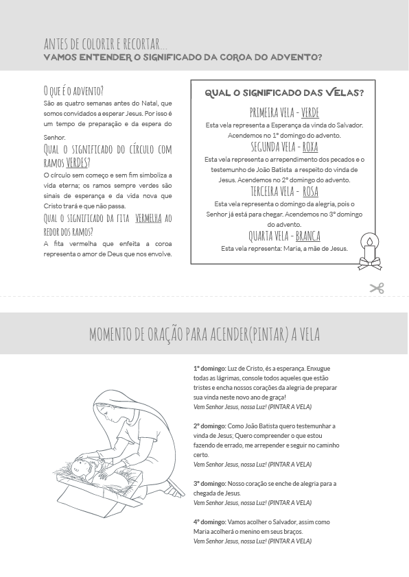 É possível fazer o download colorido ou em preto e branco para colorir, um molde com as marcações, além de uma breve explicação sobre o significado da coroa e uma indicação de momento de oração ao acender cada vela.