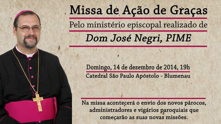 Após seis anos como bispo diocesano de Blumenau (SC), Dom José Negri, PIME, assumirá o posto de Bispo Coadjutor da Diocese de Santo Amaro, na Zona Sul de São Paulo. A despedida do pastor ocorre em dezembro e contará com missa na Catedral e homenagem na Câmara dos Vereadores.