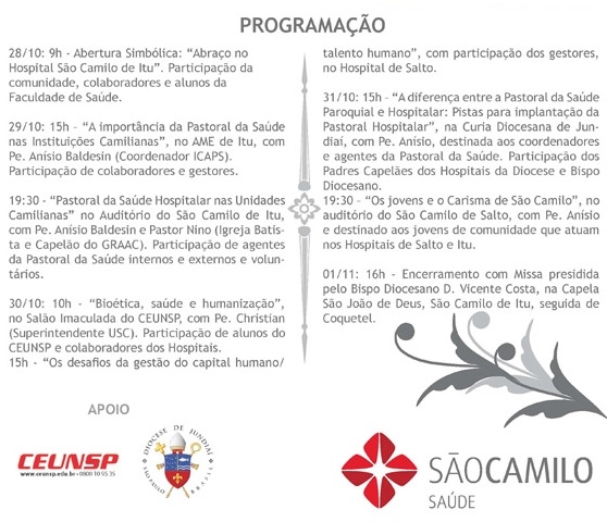 O coordenador do Instituto Camiliano de Pastoral da Saúde, padre Anísio Baldessin vai abordar o tema “A importância da Pastoral da Saúde Hospitalar nas Unidades Camilianas”. O encontro contará ainda com a presença do Superintendente da União Social Camiliana, padre Christian de Paul de Barchifontaine.