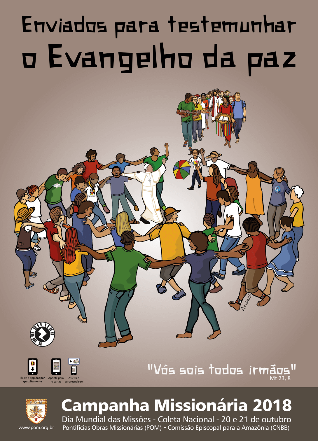 Em comunhão com a arte dos materiais da Campanha Missionária de 2017, neste ano destacamos a alegria do Evangelho de uma Igreja em constante movimento. A arte mostra a Igreja, Povo de Deus, formada por diferentes sujeitos da missão (leigos e leigas, consagrados e consagradas, diáconos, padres, bispos e o papa), representantes de todas as idades e etnias. Nesta ciranda aberta, onde todos são convidados, o Cristo se manifesta trazendo as cores sob o mundo cinza e sem vida. É a Igreja em saída, ad gentes, enviada a testemunhar a alegria do Evangelho em todo o mundo. O povo traz a Palavra de Deus, fonte da missão. As cores missionárias recordam a dimensão universal da missão. A arte é uma criação do Ateliê15.