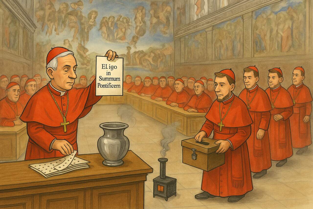 Cada cardeal recebe cédulas com a frase “Eligo in Summum Pontificem”. Sorteiam-se: 3 Escrutinadores (contam os votos), 3 Infirmarii (levam cédulas aos doentes), 3 Revisores (verificam o processo). Quem estiver impedido, é substituído por sorteio.