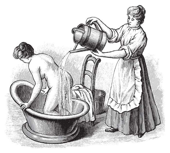 Ah, nessa época, os banhos eram tomados quase sempre em uma única banheira enorme, cheia de água quente. O chefe da família tinha o privilégio do primeiro banho em água limpa. Depois, sem trocar a água, chegavam os outros na casa, em ordem de idade, mulheres, também por idade e, finalmente, crianças. Os bebês eram os últimos a tomar banho.