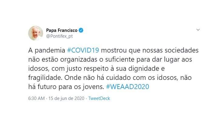 "A pandemia mostrou que nossas sociedades não estão organizadas o suficiente para dar lugar aos idosos, com justo respeito à sua dignidade e fragilidade. Onde não há cuidado com os idosos, não há futuro para os jovens".