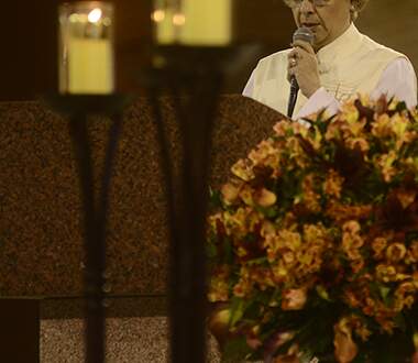 " Senhor, Jesus Cristo, Somos notas diferentes na mesma pauta do Reino de Deus. Nós Te louvamos por este tempo de pausa, de silêncio. Lembramos que a quietude de Tua mãe, Maria, permitiu que ela respondesse "sim"! E a Canção se fez gente, e habitou no meio de nós (Jo 1,14). Temos timbres diferentes, e exatamente por isso podemos cantar na trinitária harmonia dos acordes da fé, da esperança e do amor. Que possamos unir nossas diferenças para que a canção seja mais santa e mais bela. Sabemos que na vida existem acidentes. Mas não nos deixes cair na desafinação.
