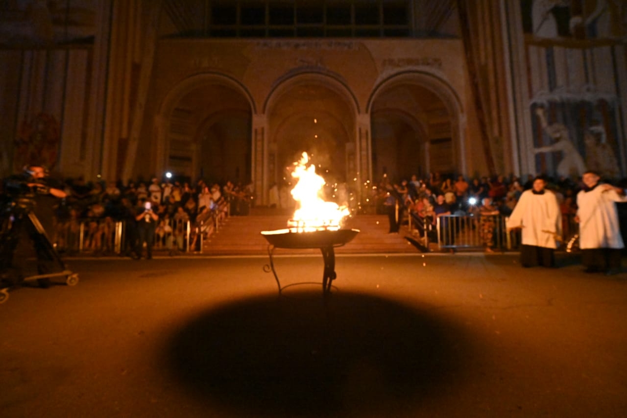 A Vigília começa com a Liturgia da Luz. O fogo novo é abençoado e o Círio Pascal é preparado com cinco grãos de incenso, que representam as chagas de Jesus. O celebrante entra com o círio na igreja escura e proclama: “Eis a luz de Cristo!”. A luz vai se espalhando entre os fiéis, que acendem suas velas.