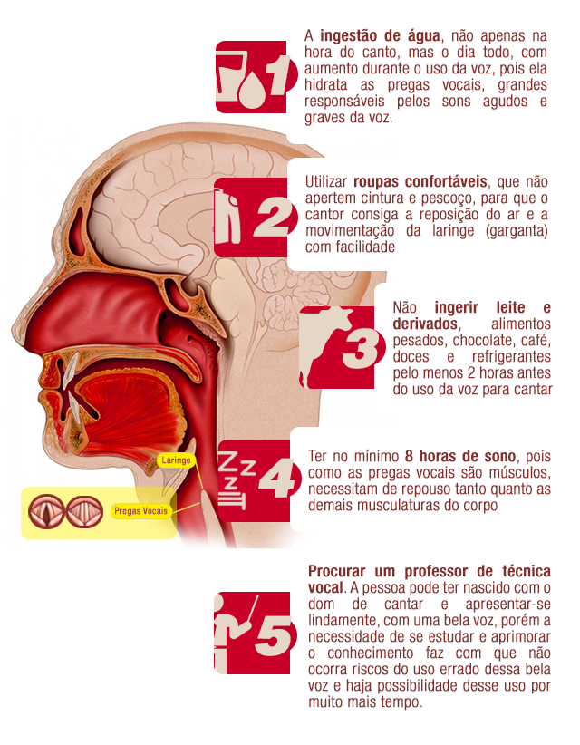 Visando apresentar alguns desses cuidados e algumas dicas, o portal A12.com/musica preparou cinco dicas com informações orientadas pela fonoaudióloga Tatiane da Silva Vieira, especialista em voz e docente de Fonoaudiologia da faculdade Sant’na em Ponta Grossa (PR). Nos textos, o músico poderá saber sobre os cuidados necessários com a voz, alimentos que contribuem para esse cuidado, ações que devem ser evitadas, tipos de aquecimento para a voz e a importância da postura e respiração.