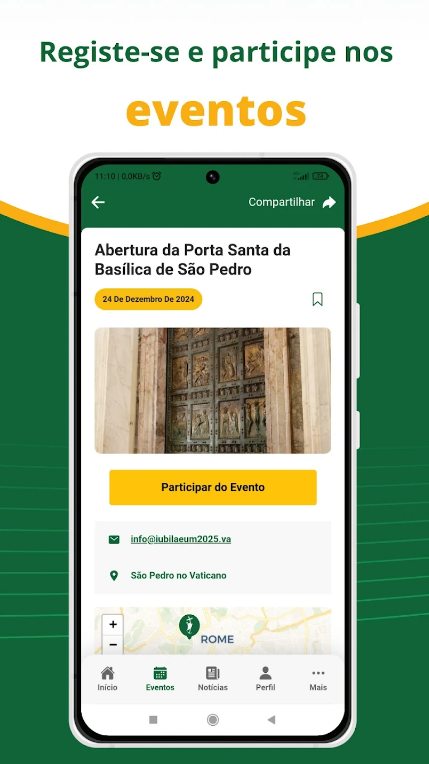 Ao baixá-lo em seu celular, será possível acessar as notícias sobre o Jubileu, registrar-se como peregrino para o Ano Santo, obter um Cartão do Peregrino gratuito, se inscrever nos eventos do Jubileu e nas peregrinações à Porta Santa.