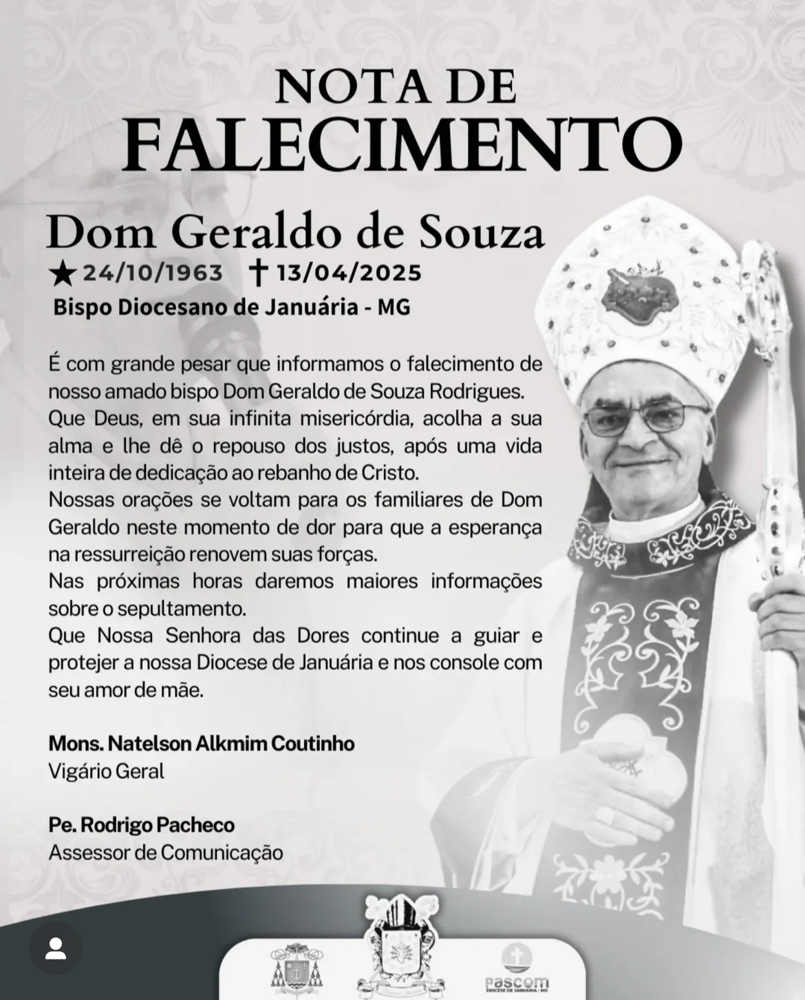 A diocese de Januária (MG), comunicou o falecimento do bispo Geraldo de Souza Rodrigues, aos 62 anos, na noite de ontem (13), Domingo de Ramos, em Belo Horizonte (MG). Após diagnóstico de câncer nos rins, dom Geraldo seguiu com os tratamentos na capital mineira e veio a falecer.