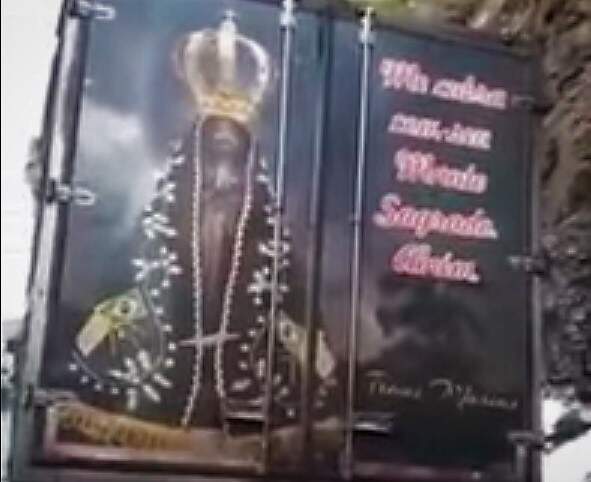 Um caminhão pegou fogo enquanto trafegava pela BR-158, em Laranjeiras do Sul (PR), na última terça-feira (04). Apesar das chamas, o que realmente chamou atenção no incêndio foi a parte traseira do veículo: a porta traseira do caminhão tem pintada uma imagem de Nossa Senhora Aparecida e ela ficou intacta após o acidente.