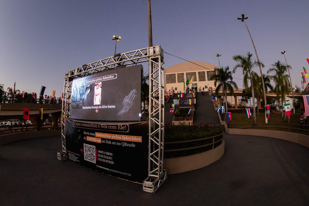 “Na porta principal do Santuário foi colocado um telão, onde as pessoas enviaram fotos das pessoas vítimas da Covid. O telão ficou sempre aceso com essas memórias. E também na rampa de acesso ao Santuário, colocamos as bandeiras de todos os países que também sofreram com a pandemia”, contou Pe. Sidney.