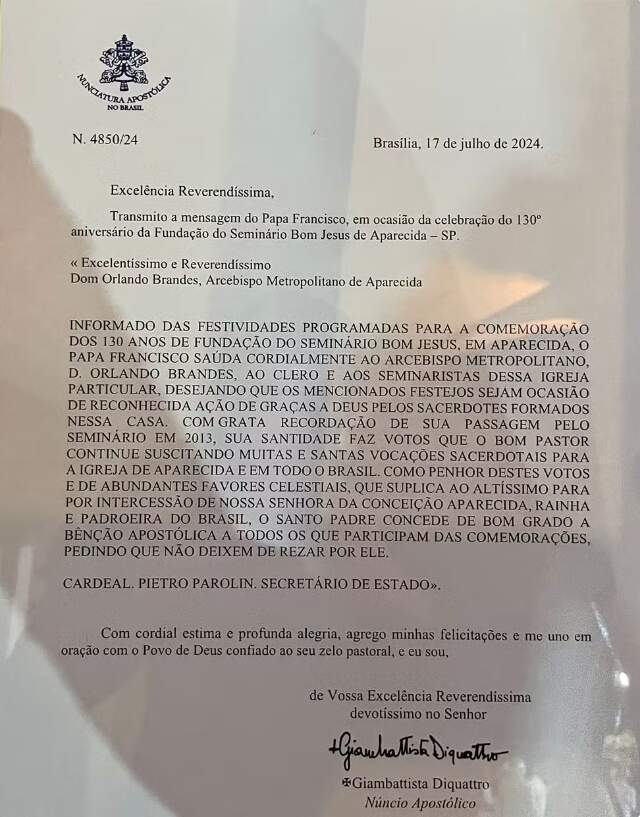“Com grata recordação de sua passagem pelo seminário em 2013, sua santidade faz votos que o bom pastor continue suscitando muitas e santas vocações sacerdotais para a Igreja de Aparecida e em todo o Brasil”, escreveu o Papa.