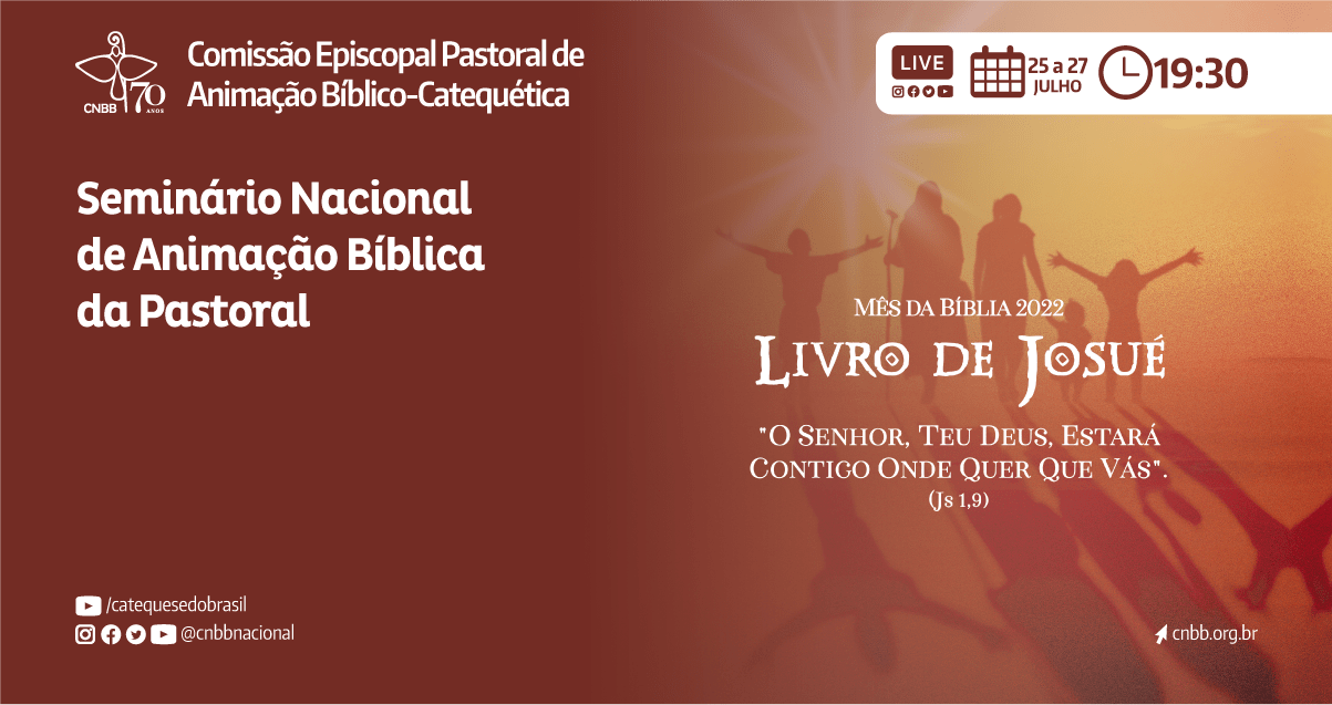 Entre os dias 25 e 27 de julho, irá ocorrer o Seminário Nacional de Animação Bíblica da Pastoral de forma on-line, com transmissão pelo YouTube nos canais da CNBB: CNBB Nacional, Edições CNBB e Catequese do Brasil, às 19h30. Leia MaisSeminário Nacional de Catequese discute a importância do Catecismo da Igreja CatólicaAprenda sobre o tempo litúrgico