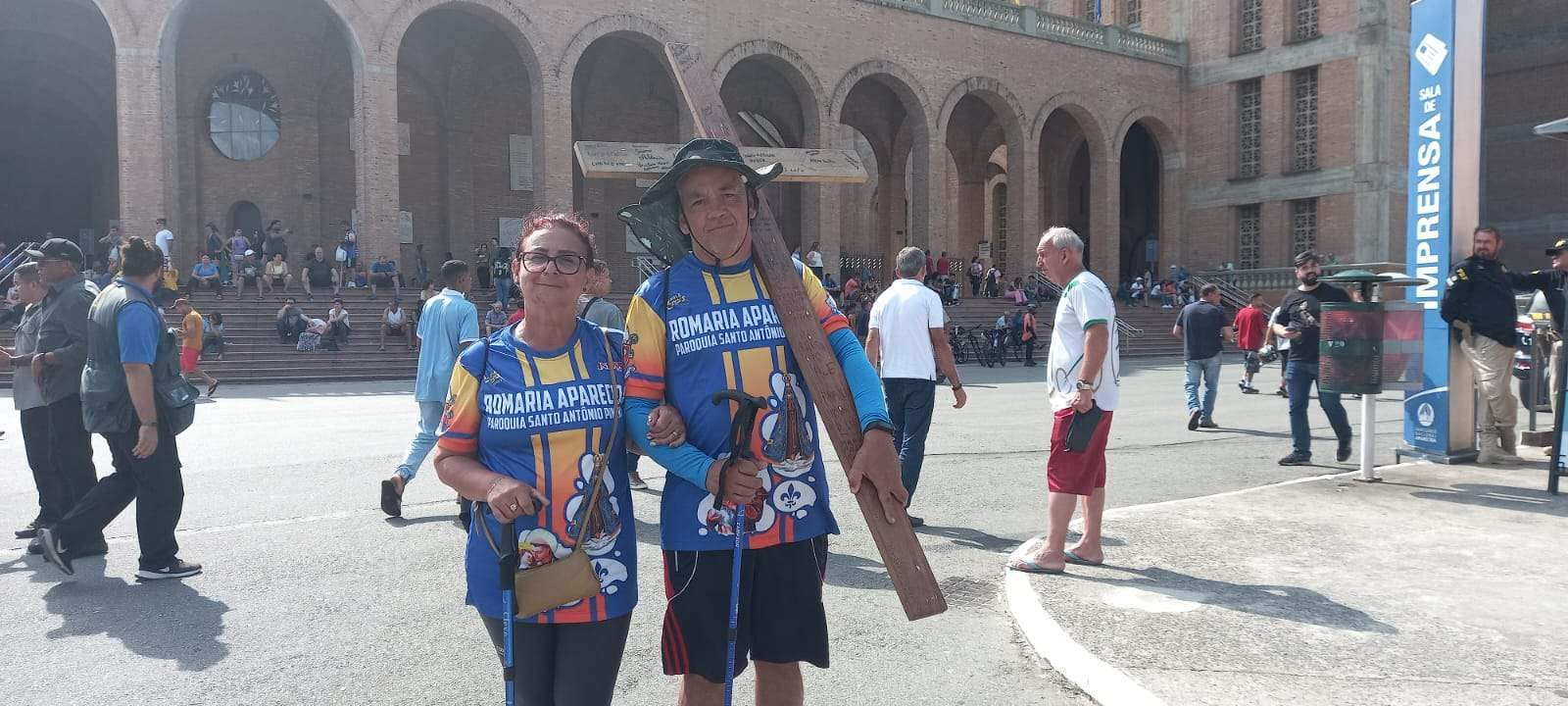 Ana Maria Nascimento e Claudio Nascimento vieram de Guarulhos (SP), trazendo uma cruz de madeira representando a Paróquia Santo Antônio Pimentas, tendo na cruz os nomes de seus companheiros e também de quem os encontrou pelo caminho.
