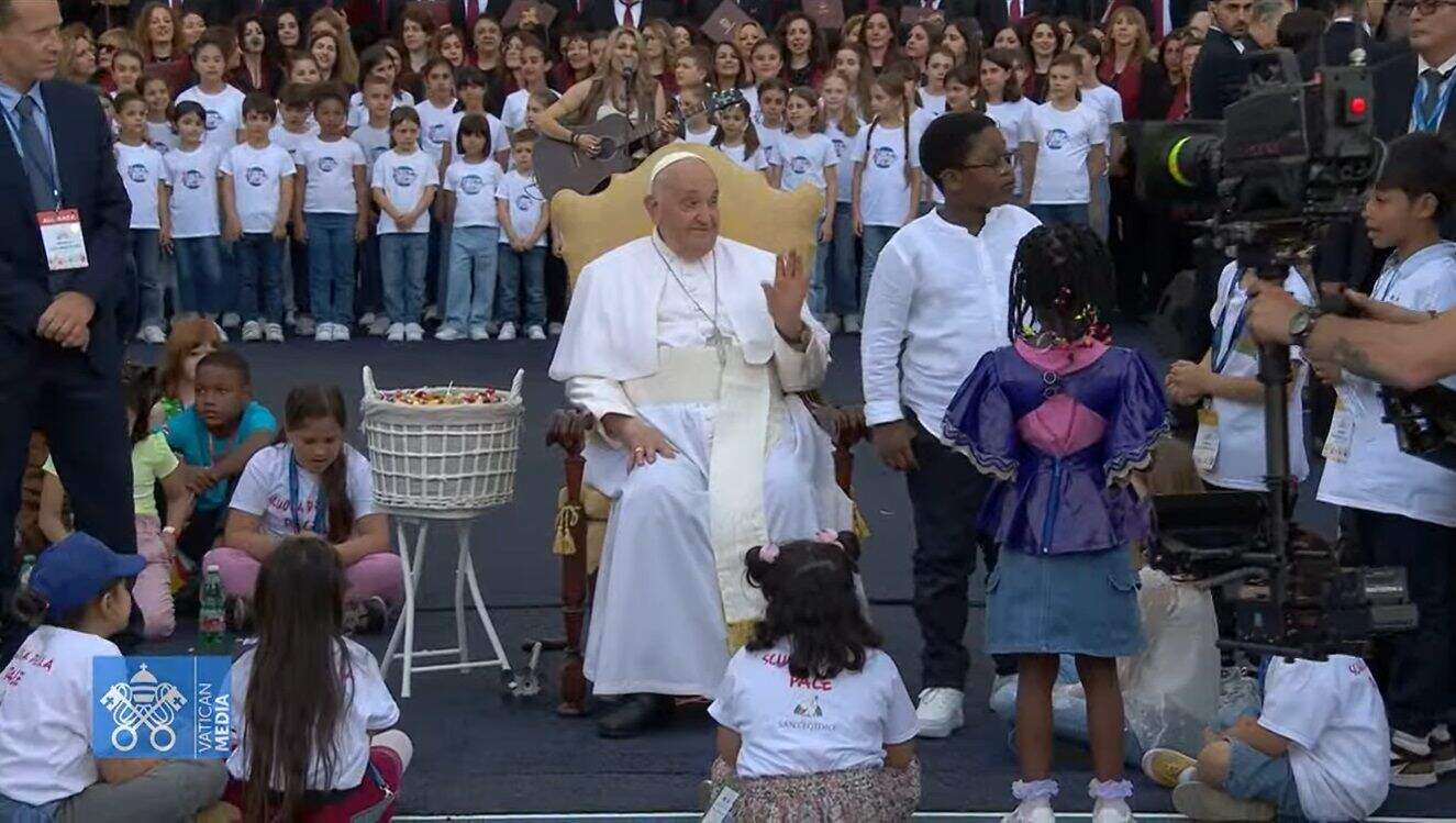 Papa Francisco chegou ao evento com felicidade, acenando para todos os presentes. Sem palco, rodeado de crianças e as presenteando com balas, palavras bonitas e reflexões, o santo padre discursou para todos.