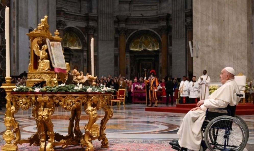 Papa enfatizou que “somos chamados a inclinar o coração e dobrar os joelhos para adorar: adorar a Deus que vem na pequenez, que habita no ambiente normal das nossas casas, que morre por amor. Deus, ao mesmo tempo que Se manifestava na imensidão do céu com os sinais dos astros, fazia-Se encontrar em um refúgio estreito; débil na carne de uma criança, envolto em panos de recém-nascido, era adorado pelos Magos e temido pelos malvados”.