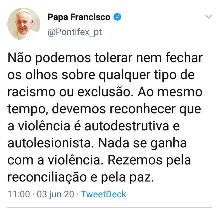 Nesta quarta-feira (03), o Papa Francisco falou dos protestos nos Estados Unidos depois do assassinato de George Floyd.
