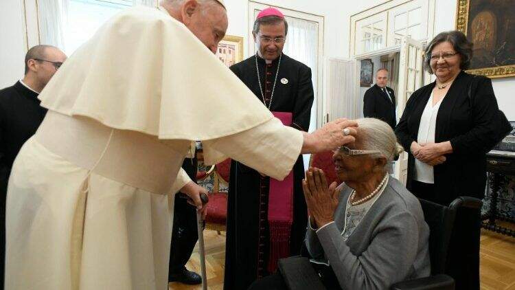 Em agosto do último ano, Francisco conheceu Maria Conceição Brito Mendonça, uma senhora de 107 anos, que nasceu no dia das aparições de Nossa Senhora Fátima, 13 de maio de 1917. Na ocasião ele recebeu dela um rosário, e no encontro desta semana, com Dom Américo, o Santo Padre enviou uma mensagem em vídeo para ela, mencionando o presente que recebeu.
