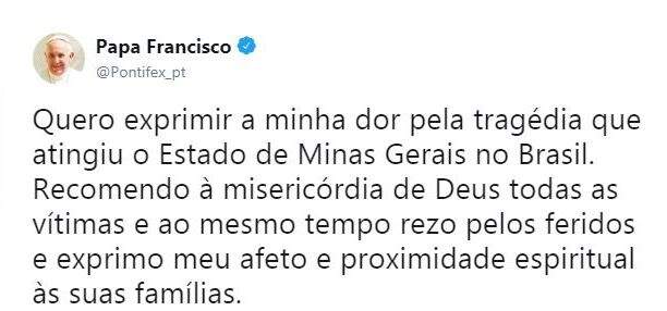 “Desejo expressar meus sentimentos de pesar pelas tragédias que atingiram os Estados de Minas Gerais, no Brasil, e Hidalgo, no México. Confio à misericórdia de Deus todas as pessoas falecidas. Ao mesmo tempo, rezo pelos feridos e expresso meu afeto e proximidade espiritual a seus familiares e a toda a população”.