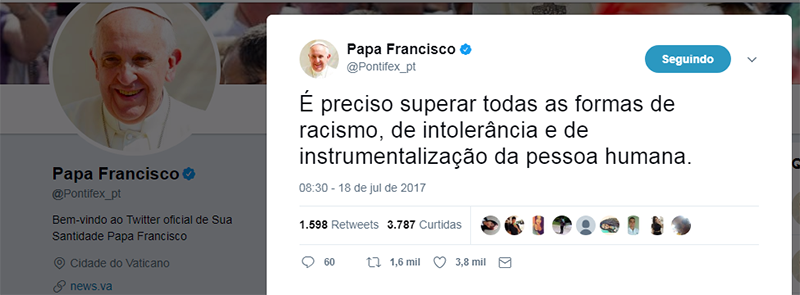 “É preciso superar todas as formas de racismo, de intolerância e de instrumentalização da pessoa humana.” Disse em um tuíte, o Papa Francisco sobre a celebração, neste 18 de julho, do Dia Internacional Nelson Mandela.