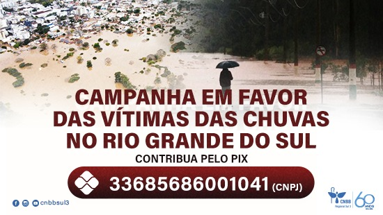 1. O Regional Sul 3 da CNBB, que compreende as áreas afetadas pelas inundações, disponibilizou uma chave PIX para concentrar as doações financeiras, que serão encaminhadas às pessoas atingidas através das dioceses locais: