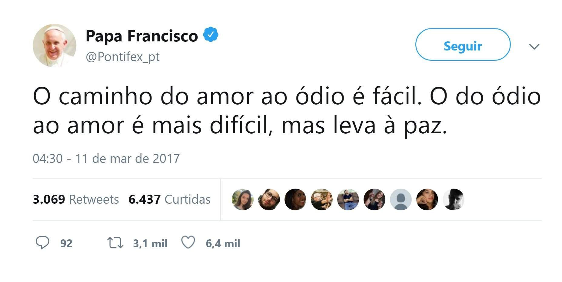 Em 11 de março de 2017, o Papa Francisco fez um tweet falando do caminho do amor ao ódio e vice-versa. O texto é curto, mas gera reflexão. Dá uma olhada!