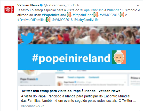 O Twitter criou um emoji especial para a Viagem Apostólica do Papa Francisco à Irlanda, por ocasião do Encontro Mundial das Famílias em Dublin, de 21 a 26 de agosto.