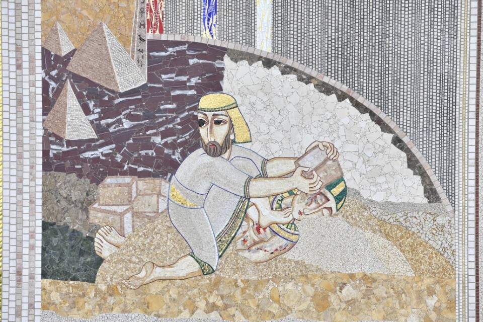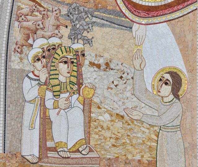 Quando o desígnio de Deus encontra o pecado, o Senhor não se retira, mas utiliza seu desígnio para destruir o pecado. Primeiramente, ele mostra que o homem que crê tudo dominar é o verdadeiro pecador, pois bloqueia a ação de Deus. O Faraó acredita que domina o Egito. Então, os fenômenos começam a acontecer para demonstrar que o cosmo deve manifestar seu verdadeiro proprietário, que é Deus. Quando a terra começa a se mexer, o Faraó começa sua ruína e nota que não domina nada. Sua figura, representada no mosaico, está ao centro, sobre um trono que desmorona, pois é outro que move as coisas desta terra e começa a libertar o cosmos do pecado humano. Sua face está confusa, como quem não compreende os acontecimentos. Ao redor dele, as pragas do Egito, descritas pelo próprio Deus como maravilhas.