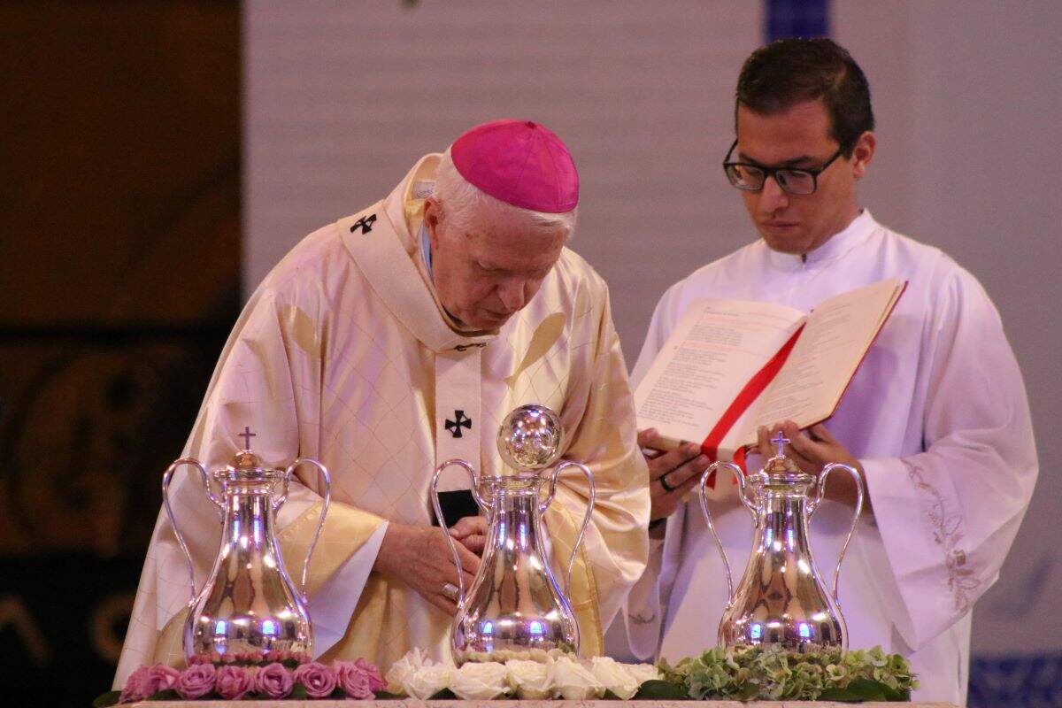 “Nesta celebração realizar-se-á a bênção dos Santos Óleos dos Enfermos, dos Catecúmenos e a Consagração do Crisma. Estes óleos serão utilizados ao longo do ano na realização dos Sacramentos, sinais visíveis da presença constante de Deus em nosso meio”, disse Padre André Gustavo, da Arquidiocese de Aparecida (SP), animador da Celebração na abertura da Missa.