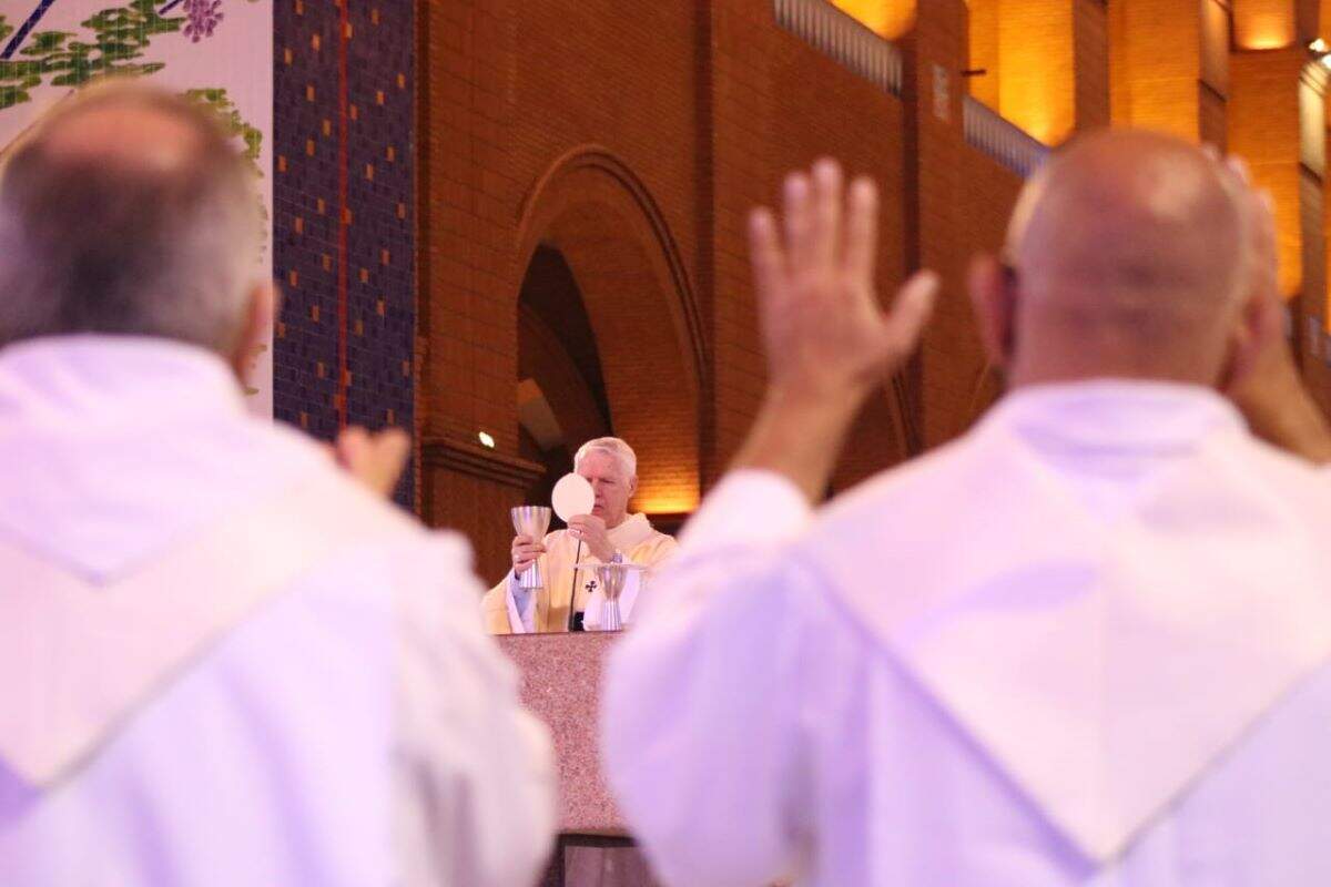 O Arcebispo iniciou a homilia da Santa Missa pedindo para os fiéis, que lotaram o Santuário Nacional, cantarem para o Espírito Santo. E logo direcionou sua fala aos devotos e também aos sacerdotes presentes no Altar Central: