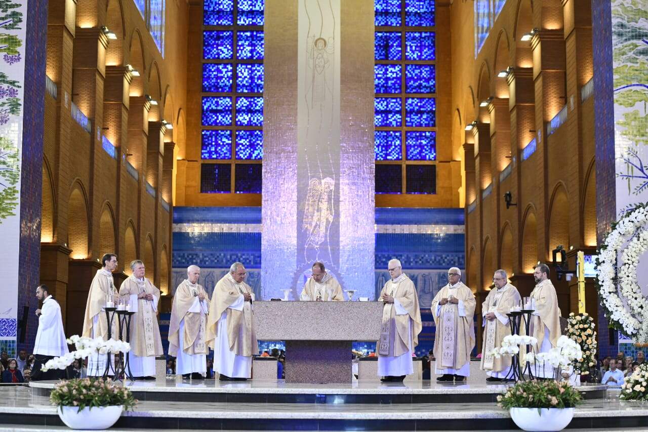 No Altar Central do Santuário Nacional, nesta quinta-feira (13), foi realizada a Missa em Ação de Graças presidida por Dom Walmor Oliveira de Azevedo, Arcebispo de Belo Horizonte e presidente da Conferência Nacional dos Bispos do Brasil (CNBB).
