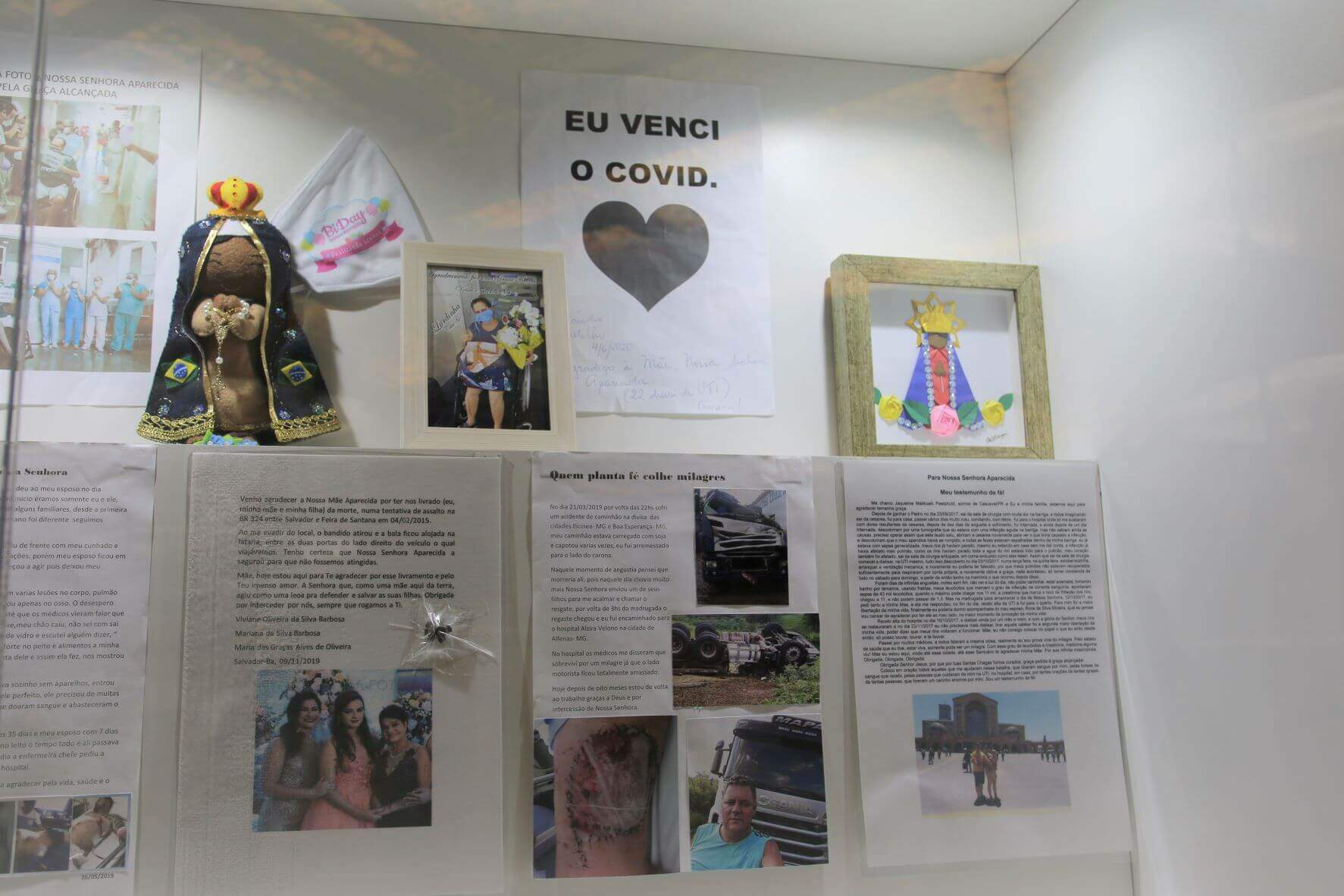 Entre milhares de itens, estão alguns relacionados à cura da Covid-19. A frase simples, impressa em uma folha de papel, “Eu venci a Covid”, está em destaque na Sala das Promessas. O local traduz a gratidão de milhares de devotos que ali deixam seus ex-votos em sinal de agradecimento.