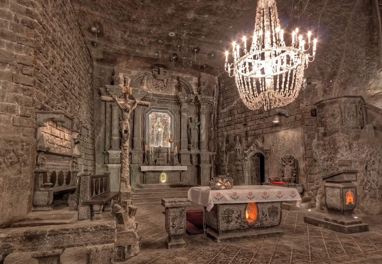 Reconhecida pela UNESCO (Organização das Nações Unidas para a Educação, a Ciência e a Cultura) como patrimônio mundial, a mina de sal na cidade de Wieliczka possui uma capela dedicada a Santa Kinga, padroeira dos poloneses, foi talhada a 330 pés de profundidade e tem uma área de cinco mil pés quadrados e 36 pés de altura.
