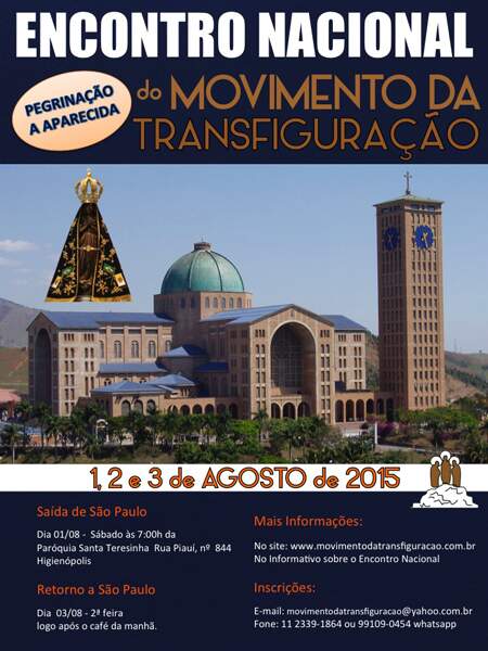 Entre os dias 01 e 03 de agosto, o Movimento da Transfiguração estará em Aparecida-SP em peregrinação. Os romeiros ficarão hospedados na Casa de Hospedagem Seminário Santo Afonso e participarão de atividades oracionais e palestras, além de visitas guiadas ao Porto Itaguaçu e ao Santuário Nacional de Aparecida.