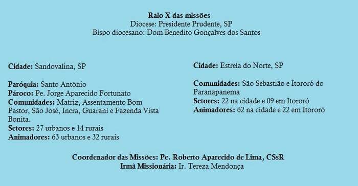 Missão nas famílias. Entre os dias 18 e 21 de fevereiro aconteceu a Pré-Missão nas duas cidades, com a visita dos missionários a todas as comunidades da paróquia e realização do Dia de Formação para as lideranças dos Setores Missionários.