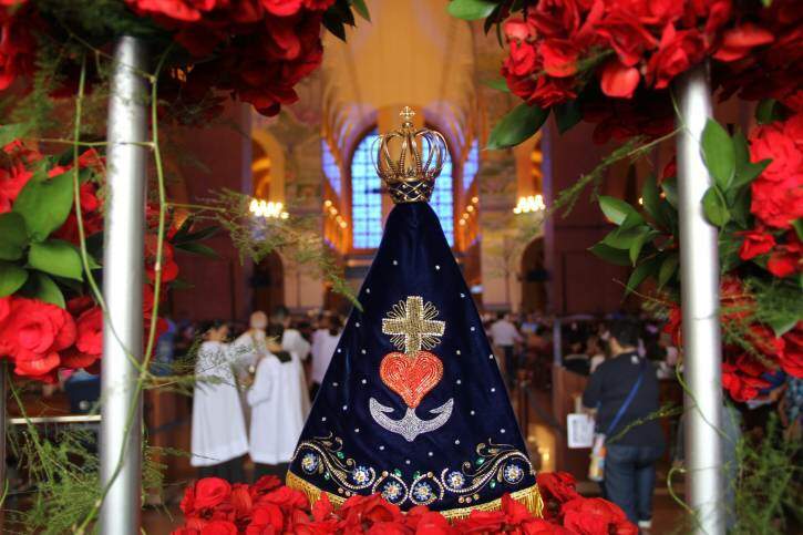 Em sua reflexão, o Pe. Jonas destacou as imagens da âncora e do coração no manto de Nossa Senhora Aparecida: