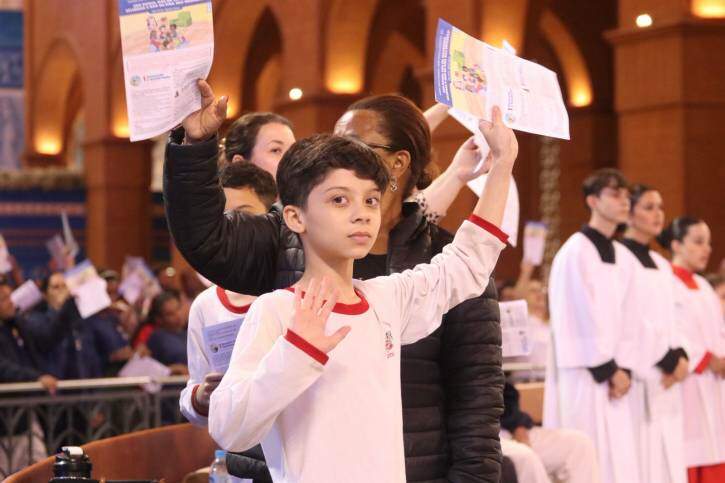 O Altar Central do Santuário Nacional contou com a participação para lá de especial das crianças nesta quinta-feira (9), no 7º dia da Novena da Tarde, em preparação para a Festa da Padroeira de 2025.