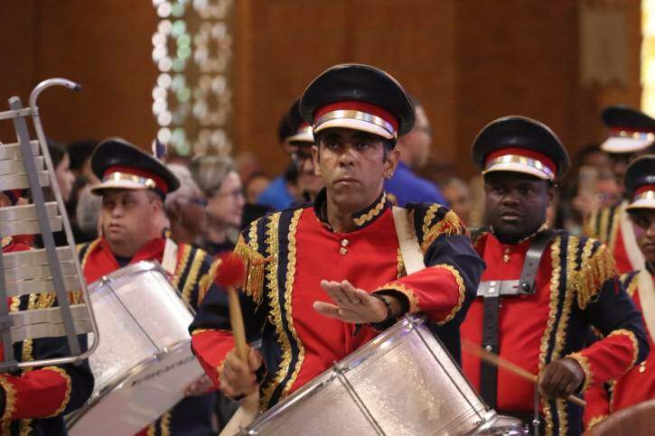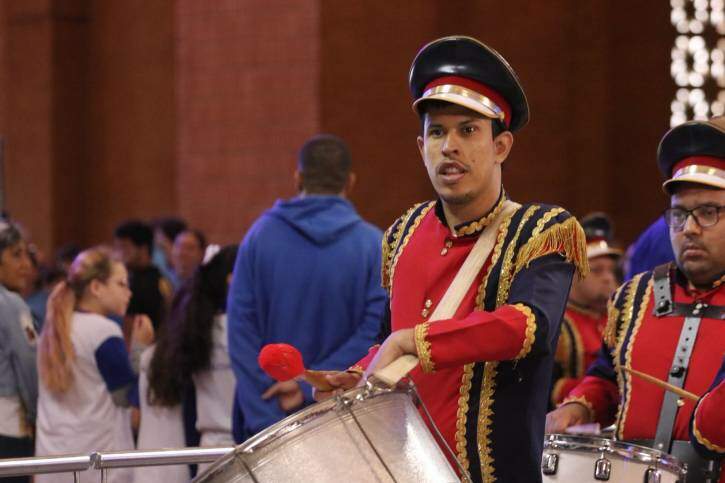 A celebração teve início com os versos “Com Maria, Mãe da Esperança, conhecer Jesus e cuidar da vida”, do hino da Festa da Padroeira, entoados a plenos pulmões pelas crianças do CAS (Centro de Assistência Social) Redentorista das cidades de Aparecida e Potim, que estavam no coro, acompanhados pelo time de músicos do Santuário.